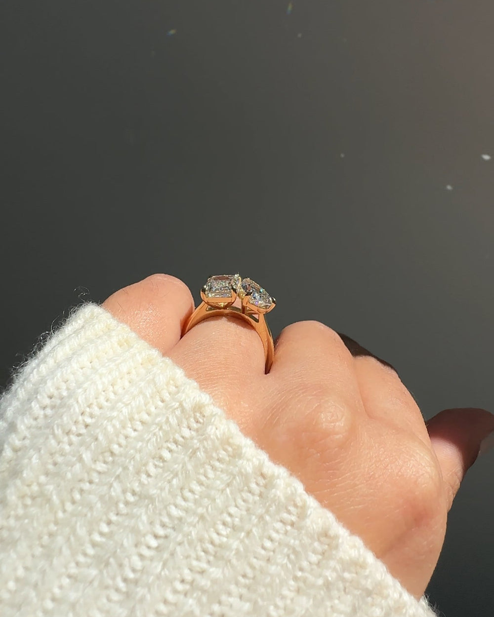 Julia showcases an exquisite pairing of pear-shaped and radiant-cut diamonds, elegantly embraced in a classic cathedral toi et moi design.